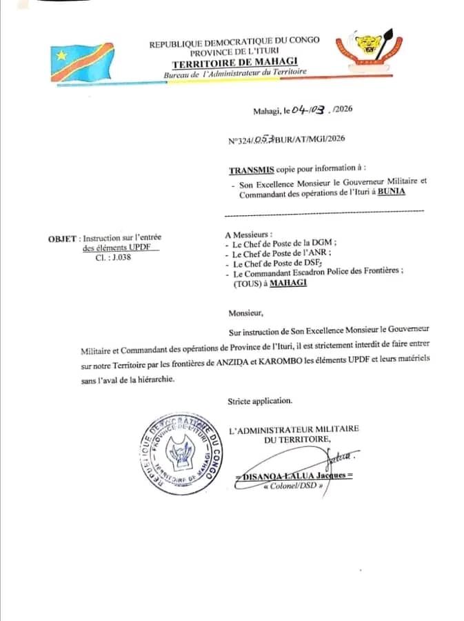 Dans une instruction officielle publiée le 4 mars 2026 par l’administrateur militaire du territoire de Mahagi, le colonel Disanoa Lalua Jacques a ordonné l’interdiction immédiate de l’entrée des éléments de l’armée ougandaise, l’UPDF, ainsi que de leurs équipements militaires par certains points de passage frontaliers.